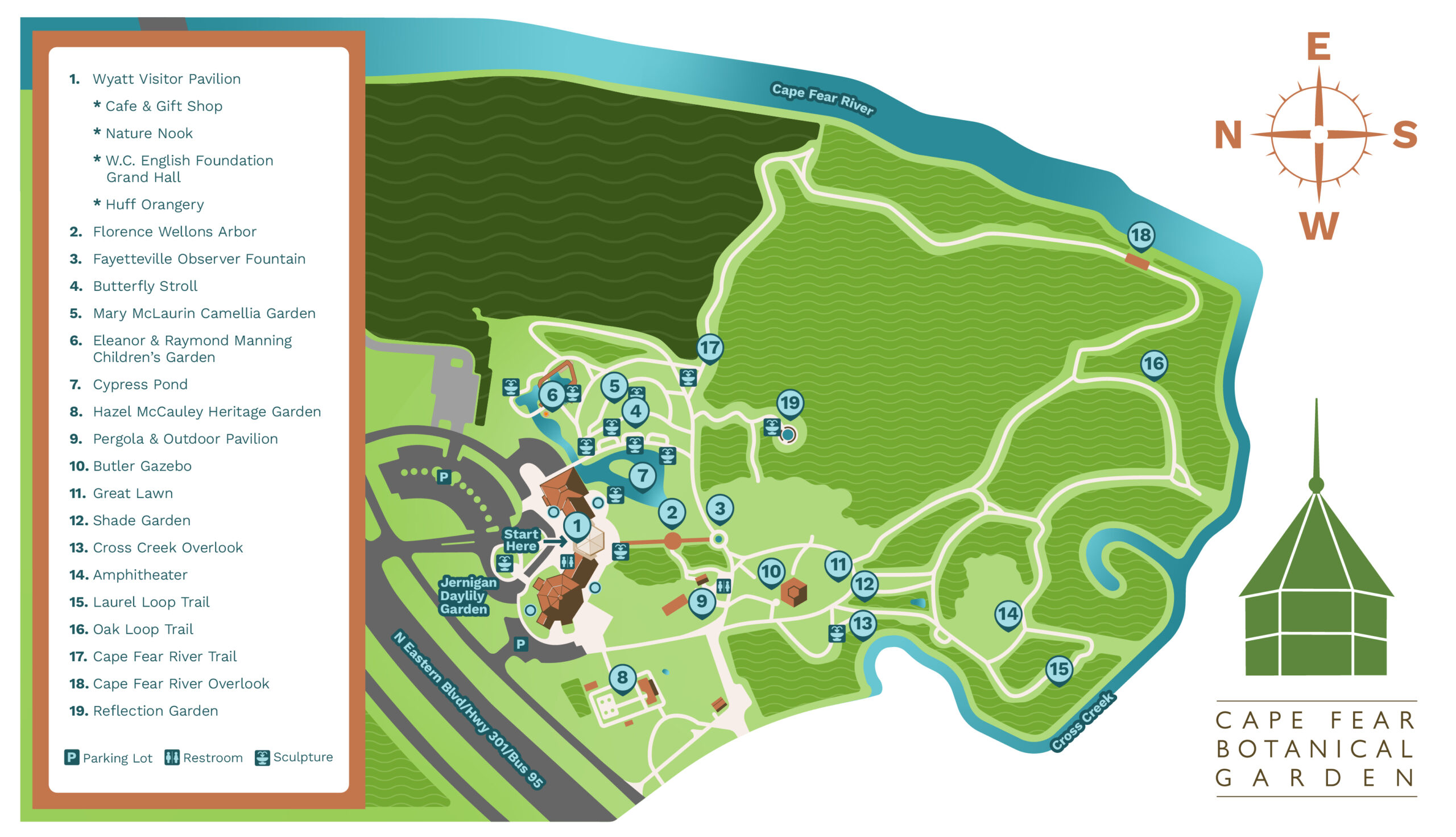 Woodland areas account for 60 of our 80 acres. The trail systems through these areas reflect the natural characteristics of the terrain. Weather conditions also may impact the site conditions and difficulty at any time. The woodland, river and overlook trails are susceptible to such conditions. The Wyatt Visitors Pavilion Complex is fully accessible and ADA compliant. Cape Fear Botanical Garden strives to provide accessibility to all visitors to the best of our abilities and encourage those with special needs to contact us in advance by telephone or e-mail. The Garden does NOT have wheelchairs or scooters available for rental.
